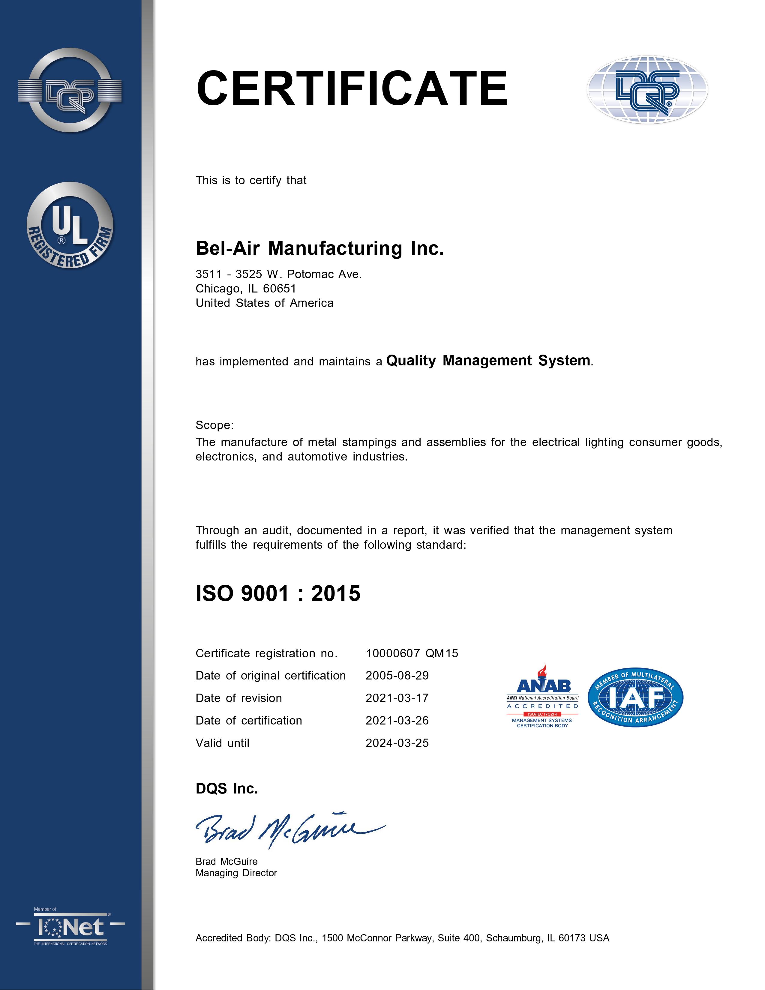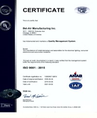 Bel-Air Mfg. is an ISO 9001 certified company registered with Underwriters Laboratories. Achieving this certifications is a testament to our focus on quality and excellence. It assures our customers we are dedicated to consistent quality and on-time delivery.